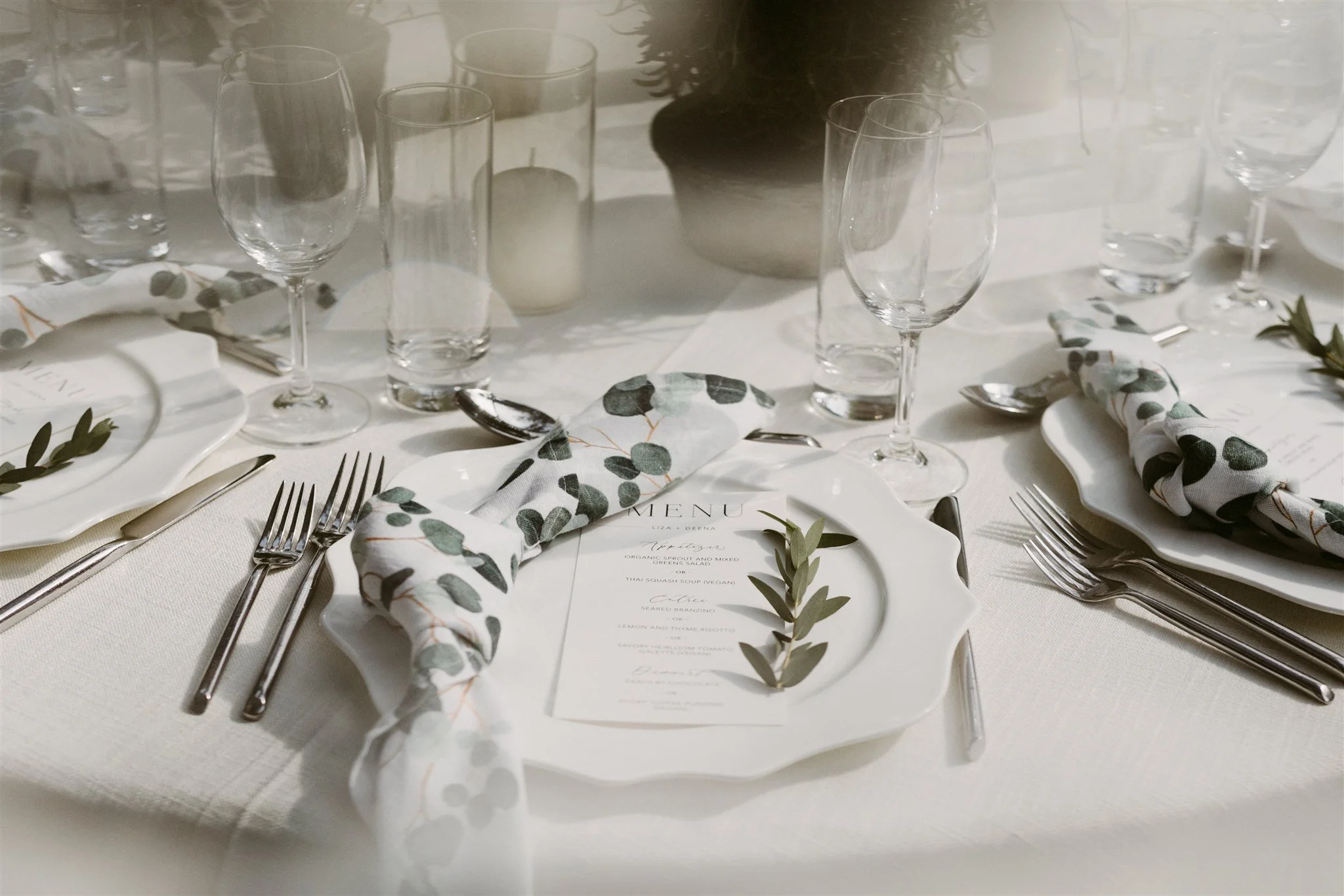 Leigh and Kevin’s wedding was simplicity at its finest. Their seating charts were hung from the ceiling and draped in greenery and their table scapes were adorned with candles and baby’s breath. Their stationery design was kept minimal but unique. Calligraphy place cards were fastened to each menu with a personalized wax seal.